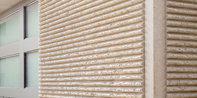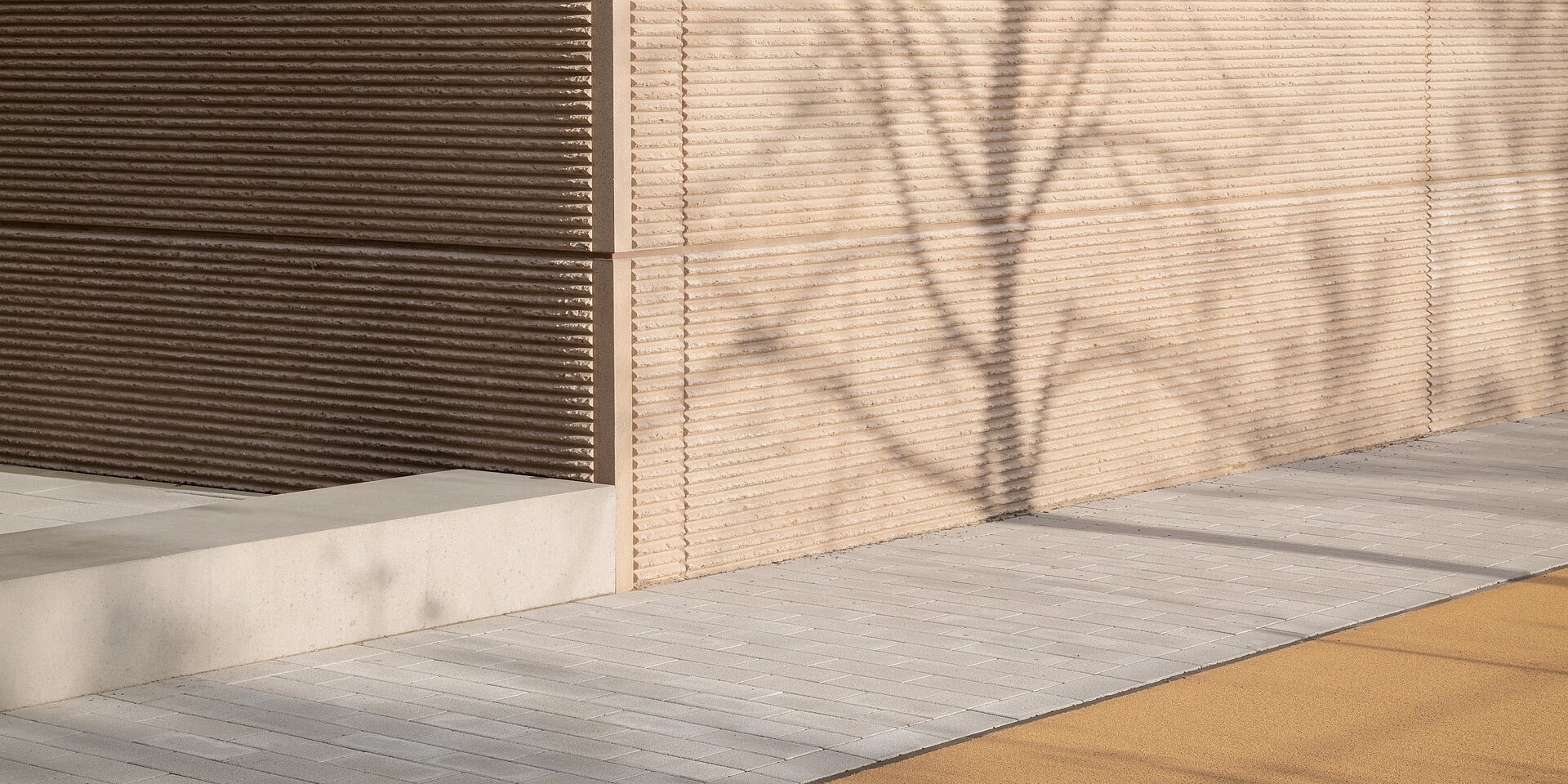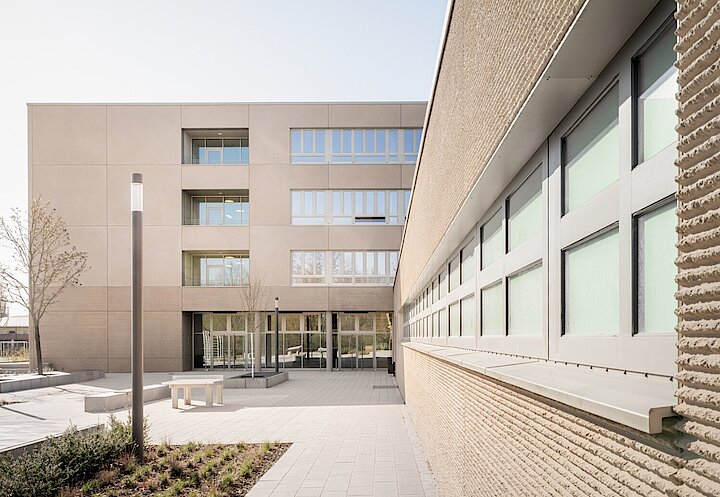 The required compactness was achieved by moving the school and sports hall slightly away from each other and then reconnecting them with a school street that runs through both buildings. This also gives the ensemble a clear division of the outdoor spaces into schoolyard, sports field and forecourt - and blends harmoniously into the urban context. In addition, a surrounding plinth emphasizes the visual cohesion of the two buildings.