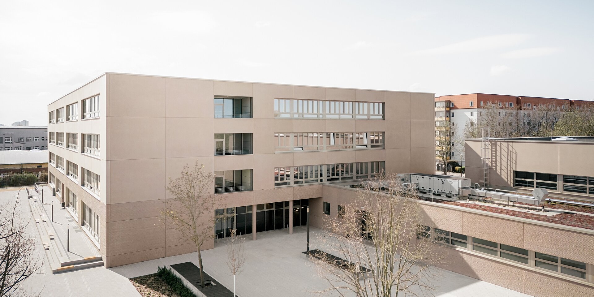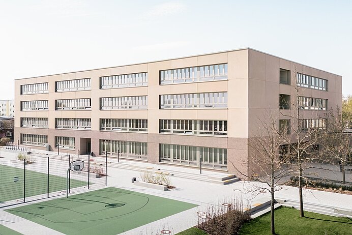 A new integrated secondary school for up to 725 pupils was to be built in the growing Berlin district of Lichtenberg. Architect Ulrike Vogel from the responsible architectural firm NAK Architekten describes the challenge: "It was clear from the outset that our design had to be as compact as possible due to the limited plot of land and the requirement to construct a three-court sports hall and a sports field with a running track in addition to the actual school building."